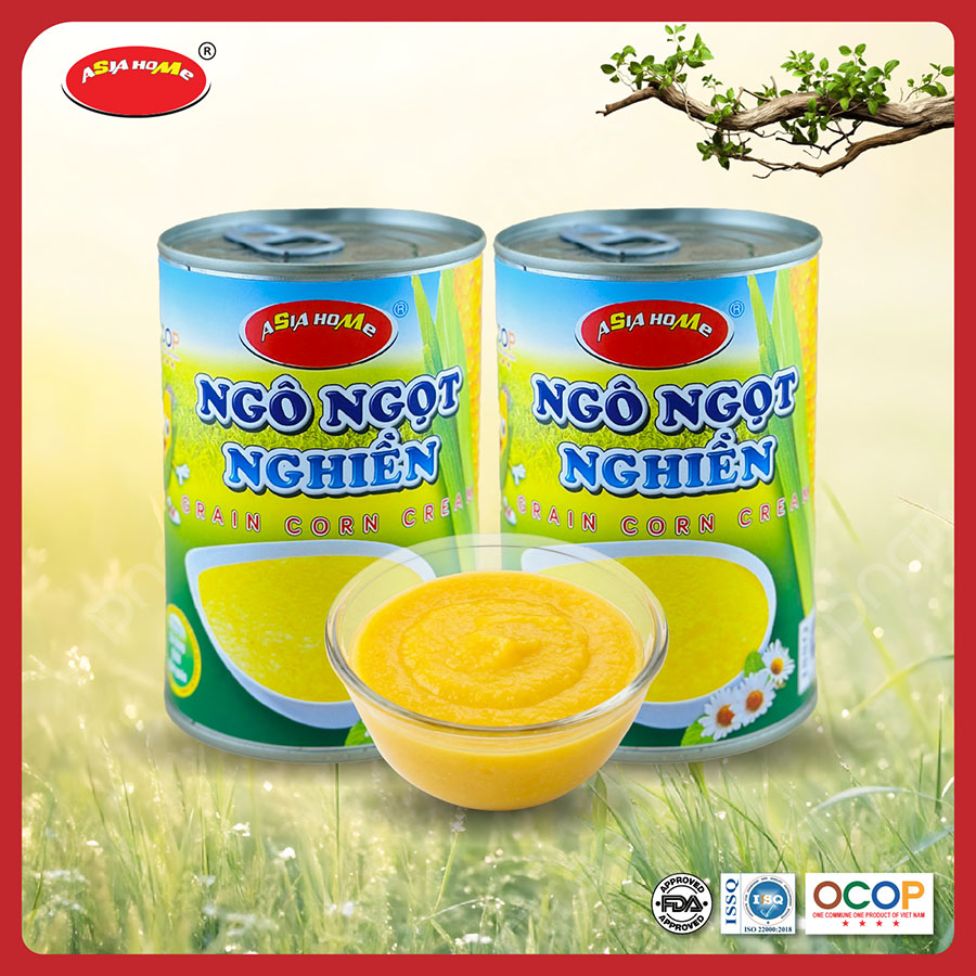Ngô ngọt nghiền lon 450g ASIA HOME được sản xuất trên dây chuyền công nghệ hiện đại, đáp ứng các tiêu chuẩn an toàn thực phẩm. Sản phẩm đạt các chứng nhận quan trọng như FDA, OCOP 4 sao và các tiêu chuẩn vệ sinh an toàn theo quy định.